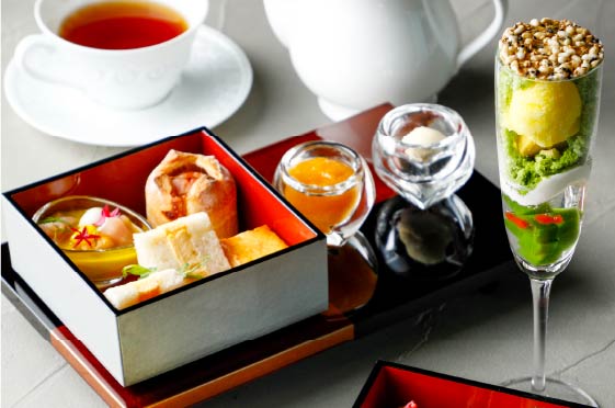 この夏、アフタヌーンティーがリニューアル。西京味噌や澤井醤油、黒七味のスイーツが並ぶ京プレートと、フルーツのさっぱりスイーツを二段重に詰め込みました。