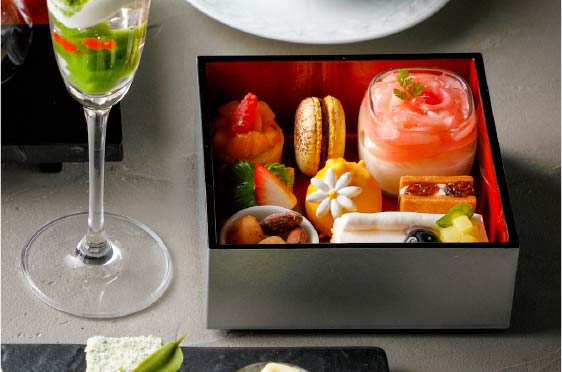 白桃ヴェリーヌやメロンショートなど、フルーツをふんだんに使った夏のスイーツをミニサイズで、お重へ詰めました。紅茶やハーブティーなど、お好みのドリンクと共にどうぞ。