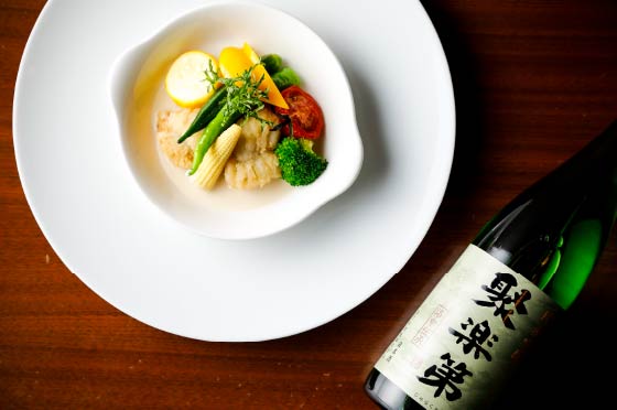 鱧のフリットを、佐々木酒造聚楽第を使ったクリームソースに。日本酒の甘みと旨味が詰まっています。祇園辻利のほうじ茶を使った一品などもラインナップ。