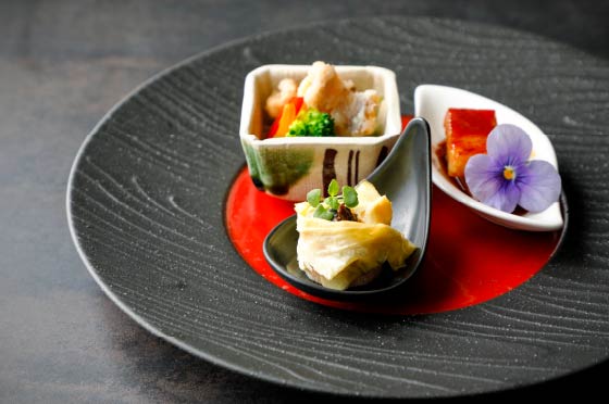まろやかな味が京料理に合う千鳥酢の南蛮漬けや、イタリアンもろみがアクセントの大山どりのラビオリ仕立てなど、3種前菜盛り合わせからコースが華やかにスタートします。