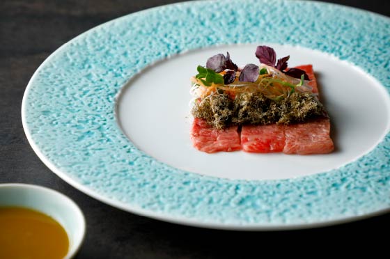 五辻の昆布出汁に、さっとお肉をくぐらせたら、酸味のきいた黒とろろと野菜を巻いて目の前で仕上げます。さっぱりとろける贅沢な味わいをお楽しみください。