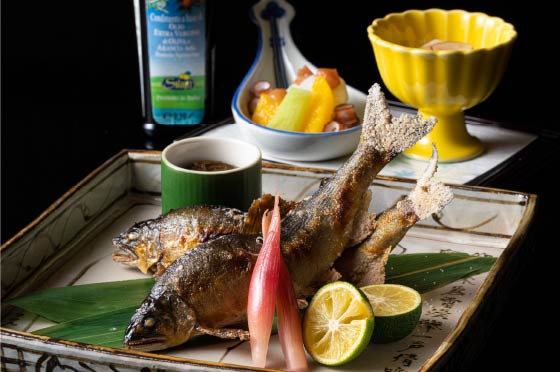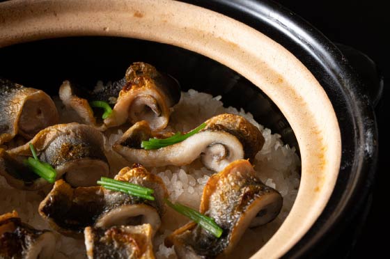 人気の釜炊き御飯は、清流の女王「鮎」をふんだんに使ってふっくら香ばしく炊き上げます。西京味噌の白味噌汁と打田の漬物を合わせてどうぞ。