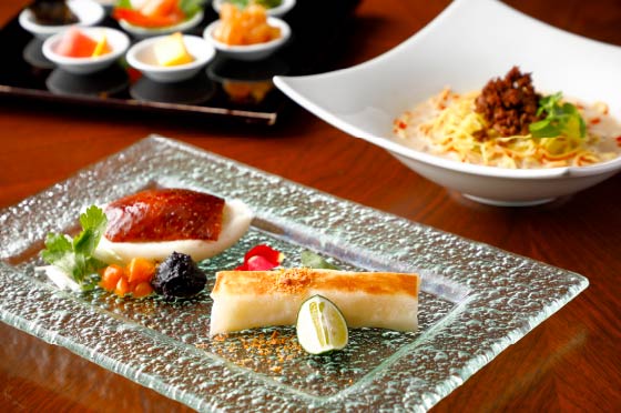 中華味噌を京もろみに変えた北京ダック、旬の鮎は黒七味風味の春巻に。西京味噌と千鳥酢を使った冷やし担々麺はまろやかでコクのある締めの一皿。