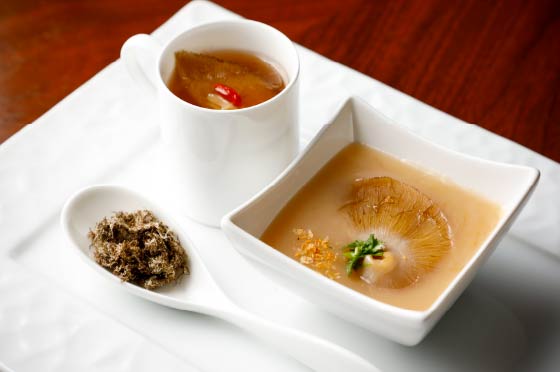 毎回様々なアレンジでご用意しているふかひれ。今夏は、地元七谷鴨・鶏のスープ煮込みと、五辻の昆布出汁蒸しスープで食べ比べ。酸味の効いた黒とろろで味変も。