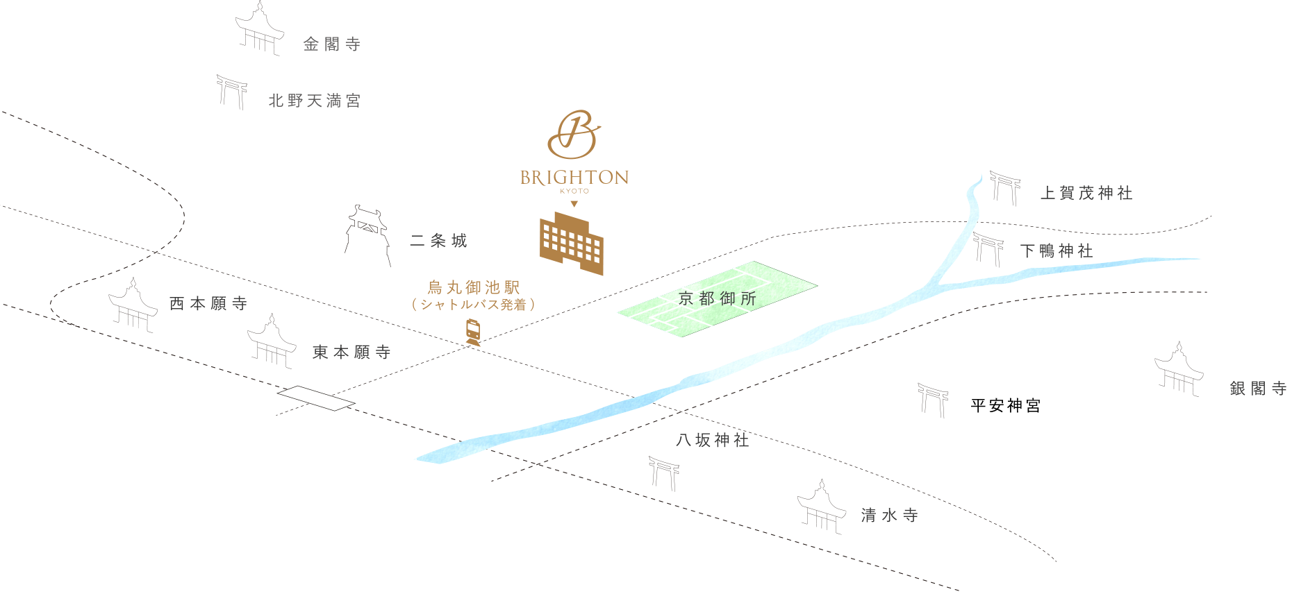 当ホテルは茶道三千家や寺社仏閣、名所、さらに歴史ある大学などに囲まれた閑静な住宅街にたたずんでおり、