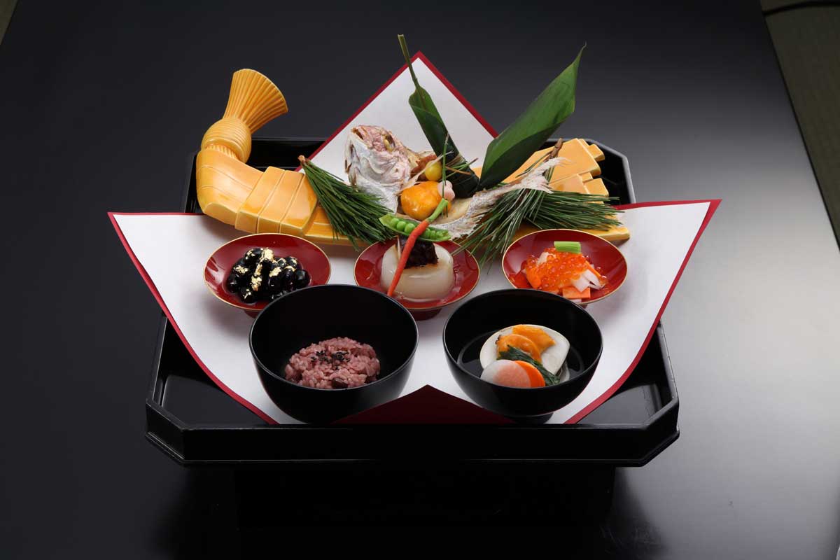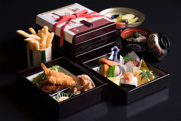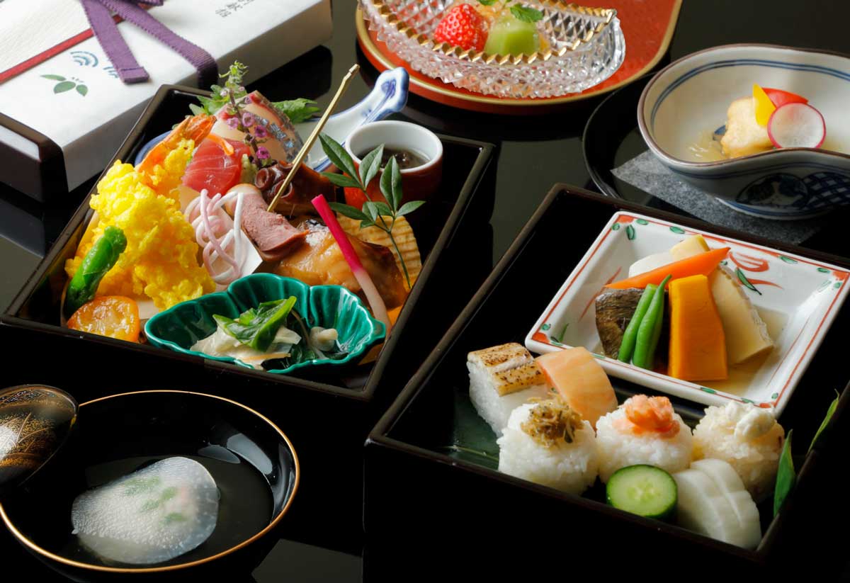 祇園祭の「くじ改め」由来の結び方で結われた二段重のお弁当。彩り鮮やかなお料理の数々が並びます。