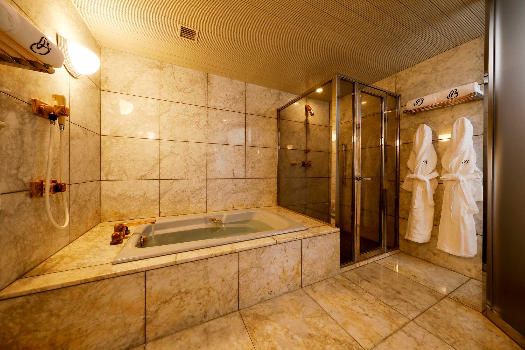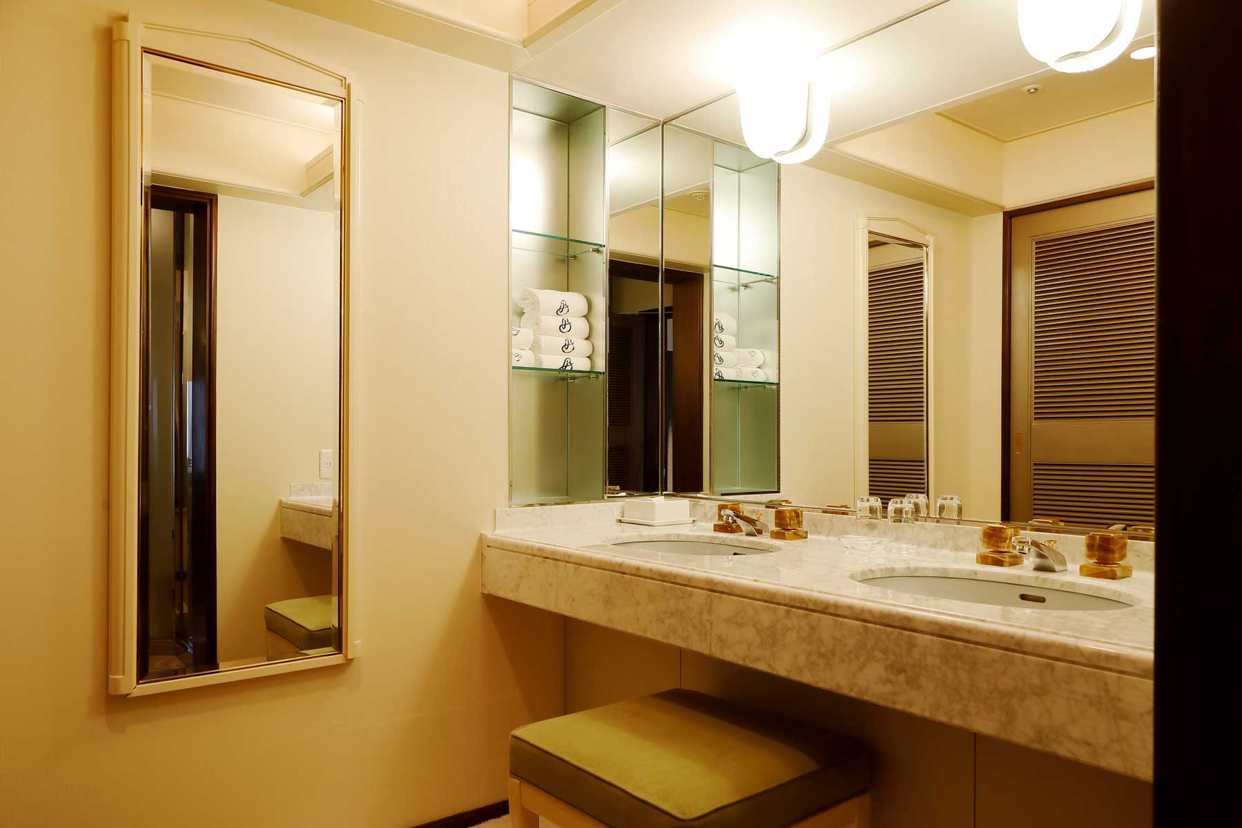 大理石でつくられた開放感あるバスルームは、心満たされる時間へと導きます。翌日の京都がより素晴らしいものになるよう、朝のお支度も優雅に、快適に。