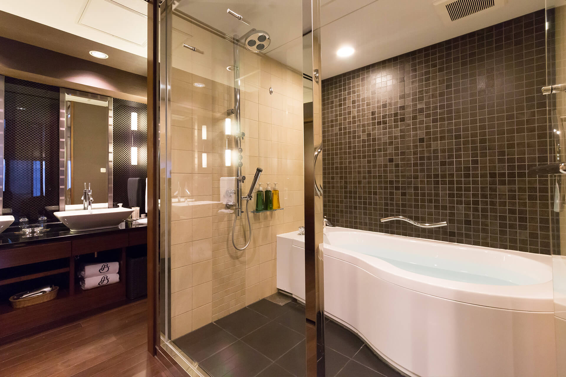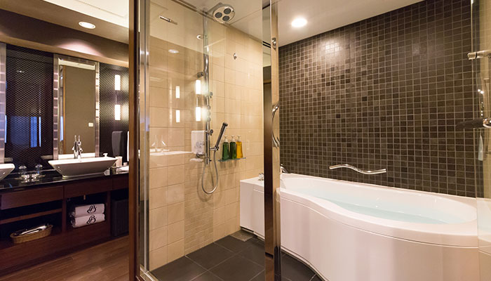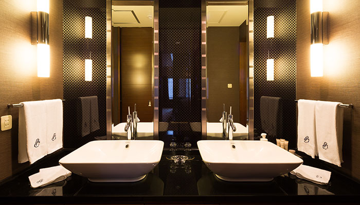 機能性を重視したバスルーム、パウダールームもゆとりの空間。翌日の京都がより素晴らしいものになるよう、朝のお支度も優雅に、快適に。