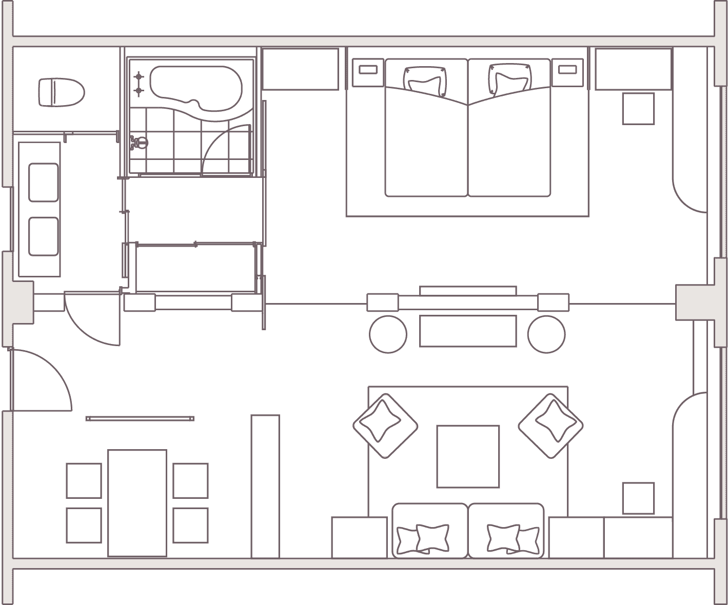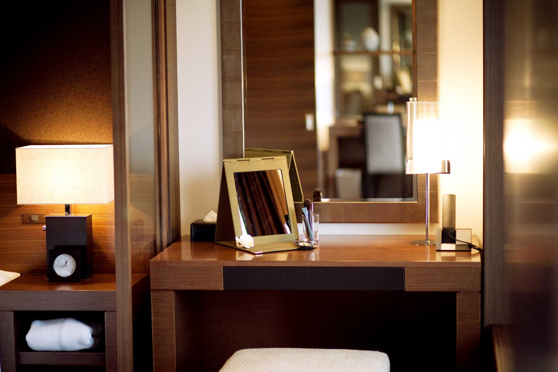 広々としたベッドルームには、メイクコーナーや大型TVを設置。贅沢なセカンドハウスのような使い心地です。 -