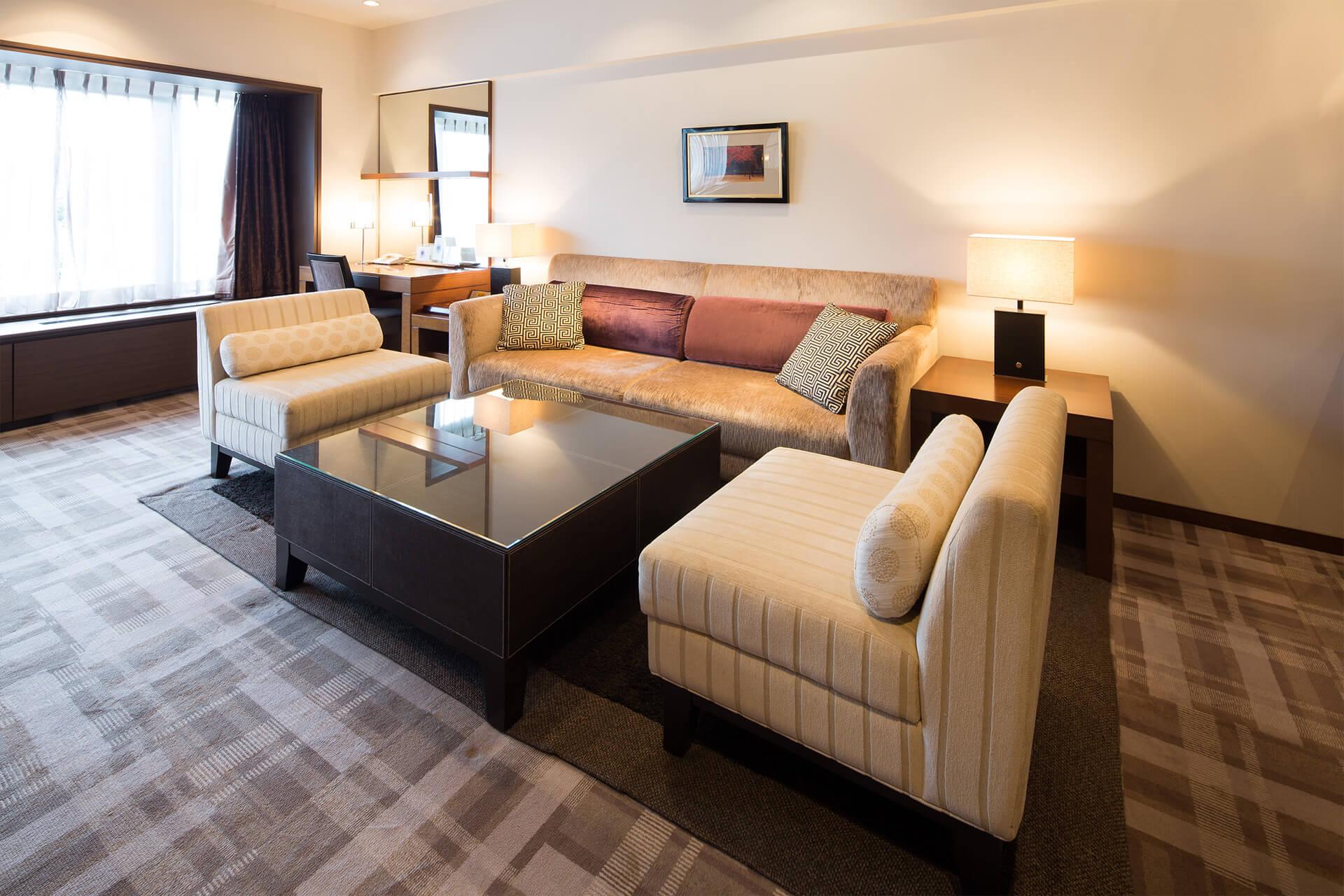 リビングスペースには、ゆったりとしたリビングソファを配置しました。親しい方々をお招きして、和やかな歓談の時間をお過ごしいただくことも可能です。 -