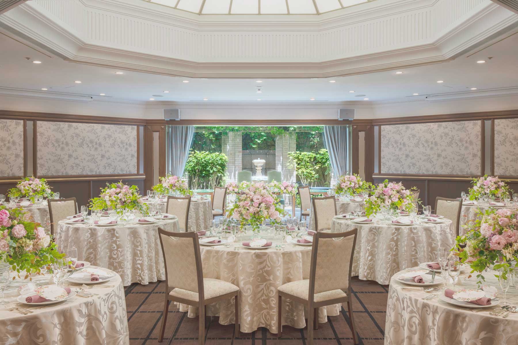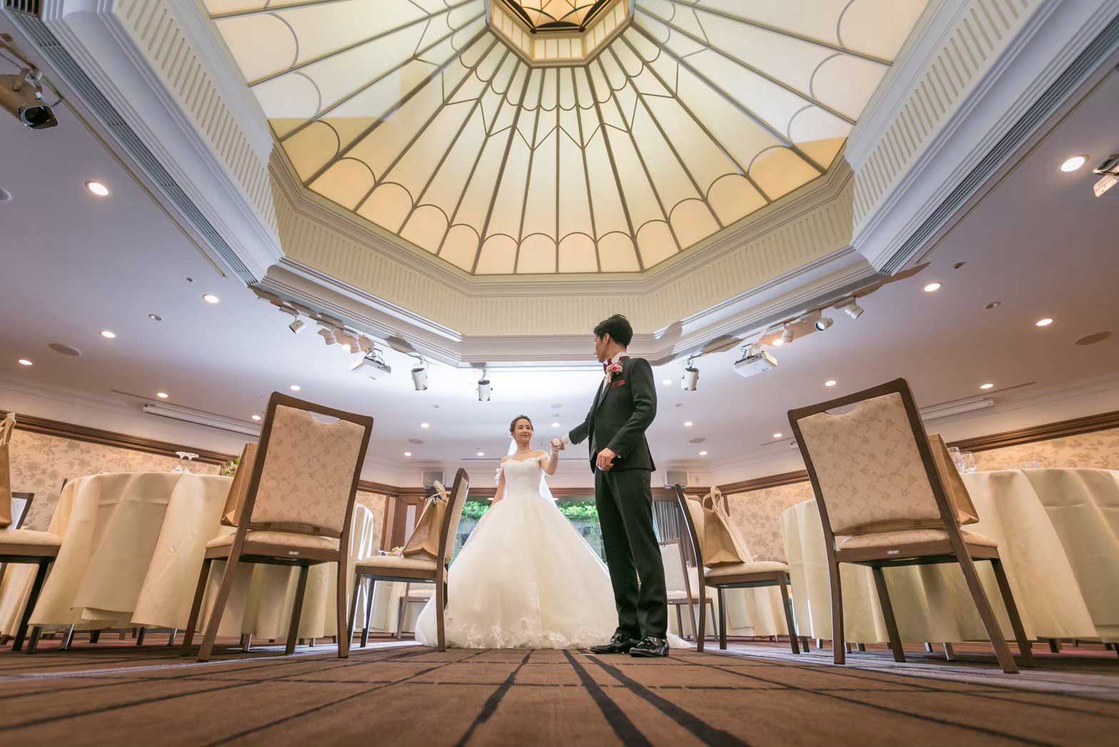 大きな窓から自然光が差し込む爽やかな会場。ドーム型の天井、八角形で角がない空間がアットホームな印象を与えます。美しいお庭を眺めながら、温かなウエディングを。